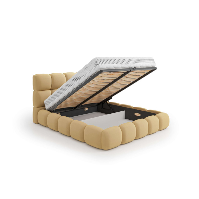 Model Cherry może być wyposażony w funkcjonalny pojemnik na pościel, który pomoże Ci optymalnie zagospodarować przestrzeń. Dzięki podnośnikowi na ramie metalowej, z łatwością uniesiesz stelaż z materacem i zyskasz dostęp do dużej przestrzeni przechowywania. To idealne rozwiązanie dla osób mieszkających w mniejszych mieszkaniach, gdzie każdy centymetr przestrzeni jest na wagę złota. Wersja z pojemnikiem sprawi, że sypialnia będzie zarówno stylowa, jak i funkcjonalna.